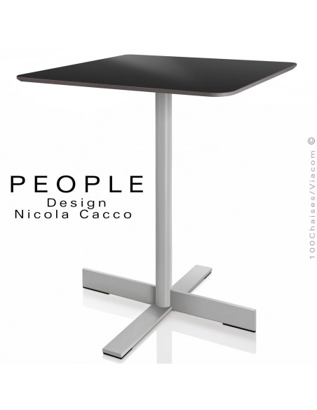 Normes européennesTable design pour hôtel, bar, restaurant, snack PEOPLE, piètement colonne centrale en tube d'acier Ø80 mm., base 4 branches plat d'acier 600 mm., encastrable Finition piétement peinture polyuréthane, couleurs sable, aluminum, blanc, noir, anthracite. Avec tampons plastiques de protection des sols. Plateau carré type compact HPL, épaisseur 10 mm., chant droit ou incliné sous plateau noir (en standard chant incliné) couleurs : blanc, aluminum, noir, anthracite, sable. Option disponible mécanique plateau rabattable. Pour extérieure et terrasse résistant aux intempéries et milieu salin bord de mer.