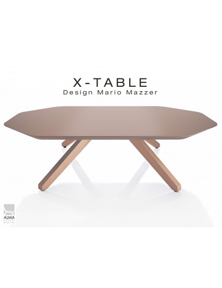 Table basse "X-TABLE " piètement Chêne pour salon, hall et salle d'attente, plateau laqué gris Tourterelle.