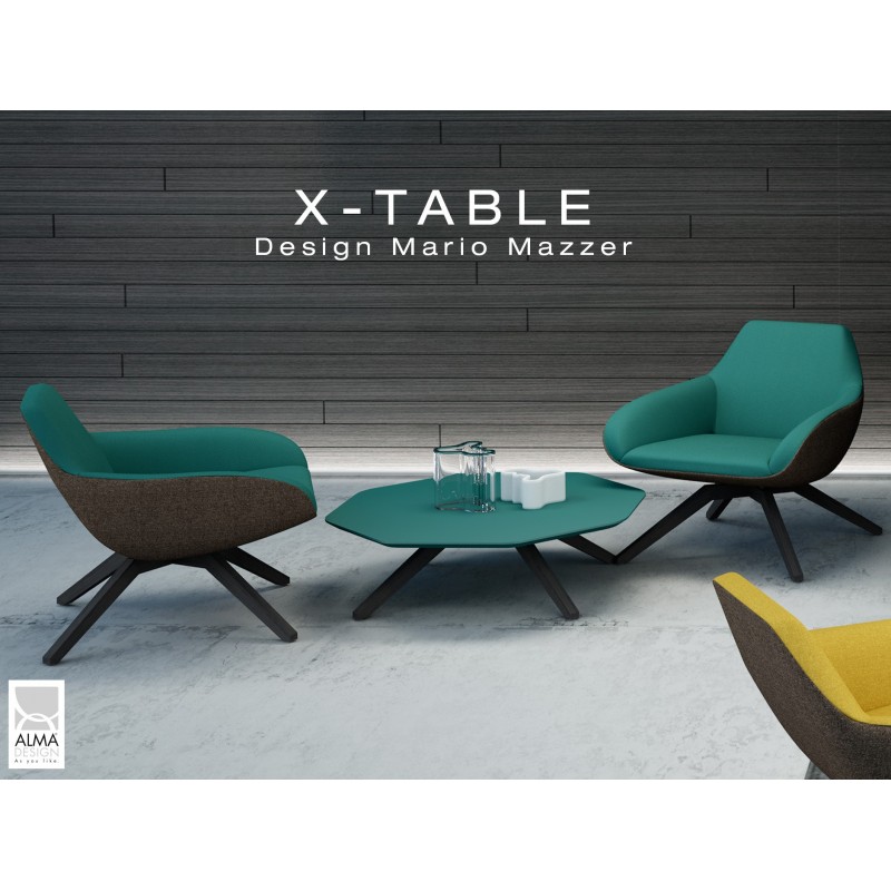 Normes européennesTable basse pour salon ou hall d'accueil X-TABLE piètement 4 pieds rectangulaire en bois de frêne massif, teinté vernis chêne. Plateau MDF épaisseur 3 cm, hexagonal avec chant incliné 45° sous et angles arrondies. Finition peinture polyuréthane voir palette. Convient uniquement pour l'intérieur.