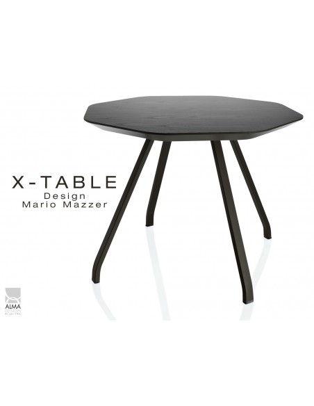 Table pour salon, salle d'attente, hall d'entrée X-TABLE, piétement 4 pieds, acier 25x25 mm, finition peinture polyuréthane anthracite (gris foncé). Plateau épaisseur 3 cm en bois de Frêne hexagonal avec chant incliné 45° sous et angles arrondies, finition vernis voir palette au choix. Convient uniquement pour l'intérieur.