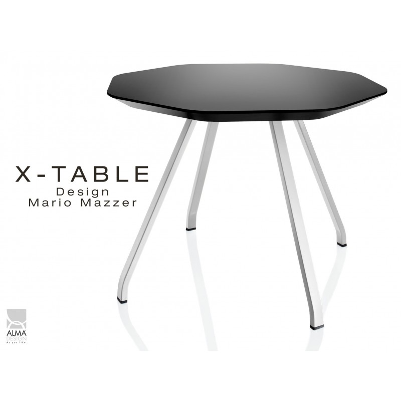 Table d'appoint pour salon, hall et salle d'attente X-TABLE, piètement 4 pieds acier 25x25 mm, finition peinture polyuréthane noir, blanc, sable. Plateau MDF épaisseur 3 cm, hexagonal avec chant incliné 45° sous et angles arrondies, finition plateau peinture polyuréthane voir palette. Convient uniquement pour l'intérieur.