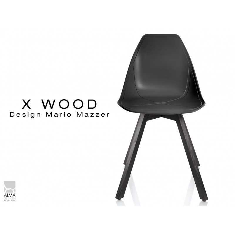 Chaise design coque piétement bois X-WOOD assise plastique, piétement vernis gris fer - Lot de 4 chaises