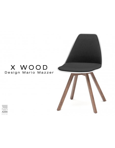 X-WOOD chaise design assise capitonnée noir, coque blanche, piétement bois vernis Noyer - lot de 4 chaises
