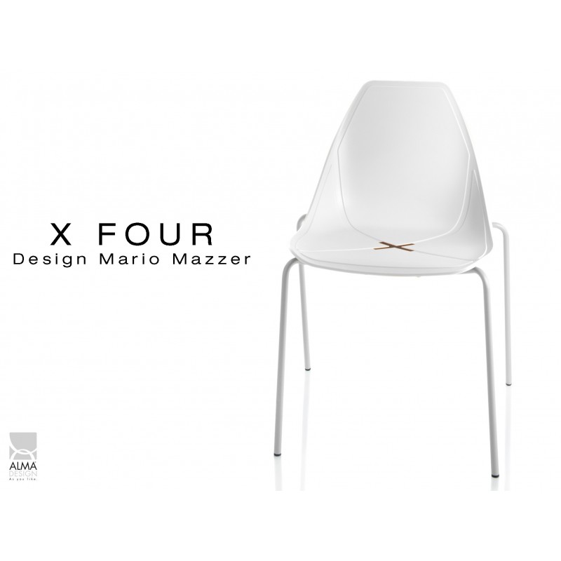 Chaise coque plastique pour terrasse X-FOUR assise polyéthylène de couleur au choix voir nuancier. Piétement 4 pieds en tube d'acier Ø1,2 cm, finition peinture polyester blanc. Elle s'intègre facilement dans tous les espaces : maison, bureau, etc… Convient essentiellement pour l'intérieur ou sous abris pour l'extérieur.