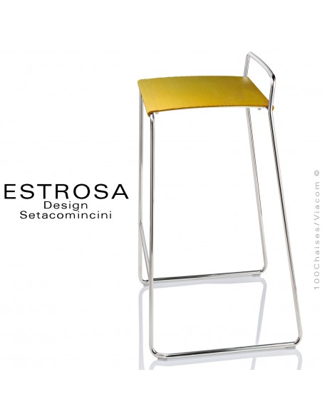 Tabouret design de bar ESTROSA-80 piétement type luge en rond d'acier Ø12 mm., finition acier chromé brillant ou peint avec repose-pieds. Assise aluminium anodisé, couleur noir, gris, rouge, violet, bleu, orange, jaune, vert. Convient essentiellement pour l'intérieur ou sous abri pour l'extérieur version peinte. Avec tampons plastiques de protection des sols.