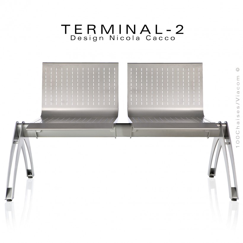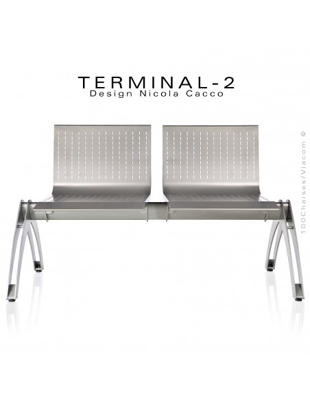 Normes européennesBanc design pour salle d'attente, lieu public, aéroport, vestiaire ou salle de sport TERMINAL, assise deux places, structure tube et plat d'acier, finition peinture polyester couleur gris-aluminium réf.: VA ou anthracite réf.: VT (voir palette peinture). Piétement avec quatre tampons plastiques noir réglables (mise à niveau). Assise avec dossier en tôle d'acier micro-perforée. Convient pour l'intérieur et l'extérieur.